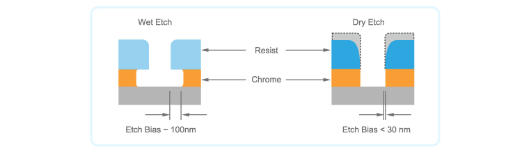 Etch normally includes dry etch and wet etch. In normal case, dry etch is necessary for less than 180nm in order to ensure the processing precision and graphic quality.