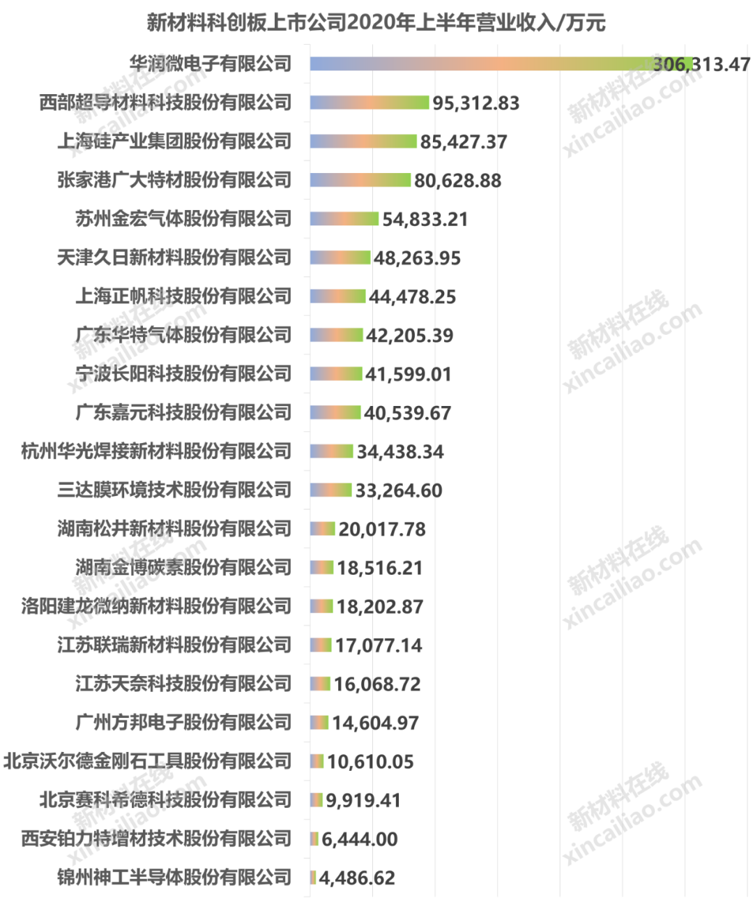 截止目前,共有22家科創板新材料公司發布了2020年半年度報告。財務數據顯示,2020年H1,22家公司創造了104.3億元的收入,排名前5家公司營業收入均超過5億元,CR5接近60%。其中華潤微以30.6億元的營業收入名列第一,營收占比接近30%。